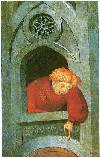 Noi abocat a la finestra, retaule de Sant Andreu, L. Borrassà, segle XV.