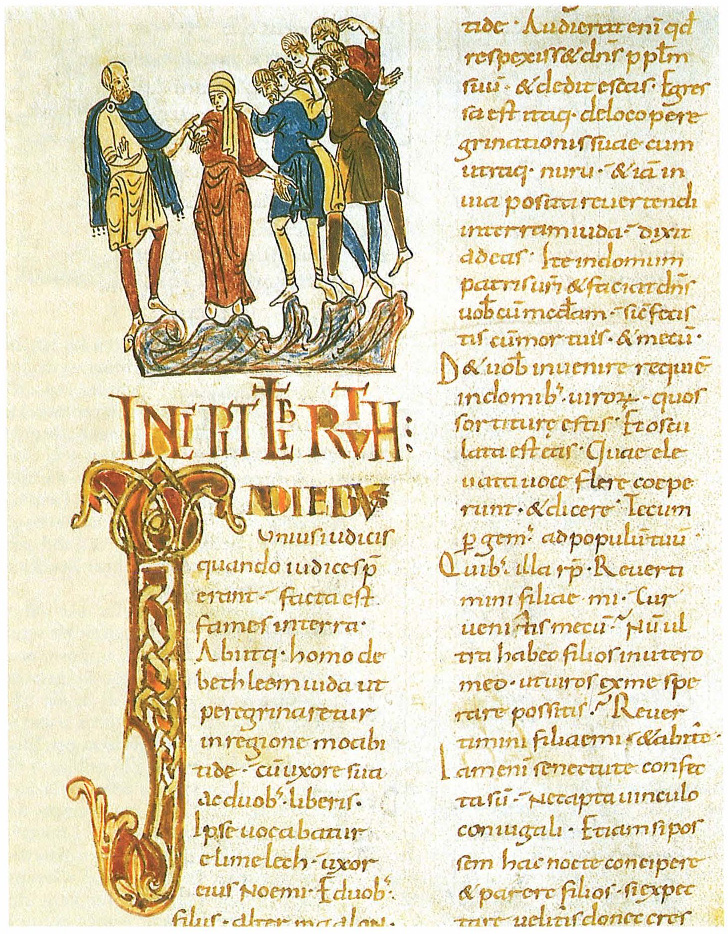 Grup d’homes i dona davant d’un senyor, Bíblia de Rodes, monestir de Santa Maria de Ripoll, segle XI.