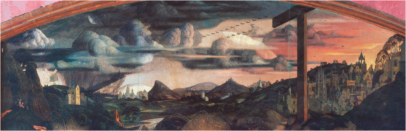Paisatge pertanyent a la Taula de la Pietat, obra de Bartolomé de Cárdenas, el Bermejo. El 1490 Lluís Desplà, canonge ardiaca de la catedral de Barcelona, va encarregar a Bartolomé de Cárdenas la pintura d’una taula amb la Pietat de Crist per a la capella privada de casa seva, al fons de la qual pertany aquest paisatge, que inclou, potser, la representació de la ciutat de Jerusalem, a la dreta. En aquesta obra, el pintor posa en joc tota la seva habilitat i les tècniques pròpies de la pintura flamenca (especialment l’ús de l’oli com a aglutinant del pigment) per a descriure els fenòmens atmosfèrics i suggerir la profunditat i la llunyania d’un paisatge tempestuós.