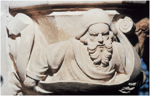 Home barbat amb filacteri, probablement un apòstol o un profeta, escultura de la imposta superior dels pilars centrals del presbiteri. De vers el 1433-40, en destaca el realisme i l’expressivitat.