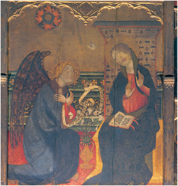 Anunciació, taula central del retaule de Sant Gabriel. Aquesta situació privilegiada del tema de l’encarnació és freqüent en retaules italians del segle XIV però és excepcional a Catalunya.