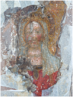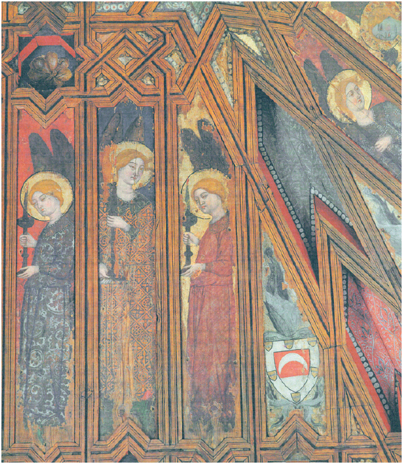 Detall de les pintures del sostre de la capella del castell de Mesones de Isuela (Saragossa), amb àngels ceroferaris i un escut dels Luna. Tant la temàtica angèlica com la relació de Pere de Valldebriga amb terres aragoneses permeten apropar aquestes figures a la primera fase d’activitat del pintor.