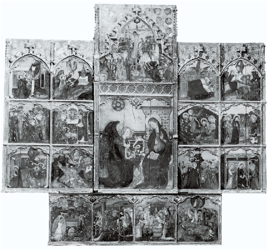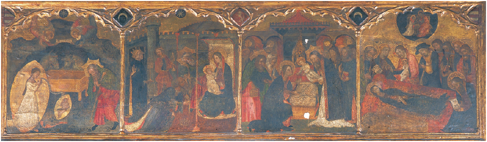 Nativitat, Epifania, presentació al Temple i dormició de la Mare de Déu, escenes de la predel·la del retaule de Sant Gabriel, dedicada a la figura de Maria.