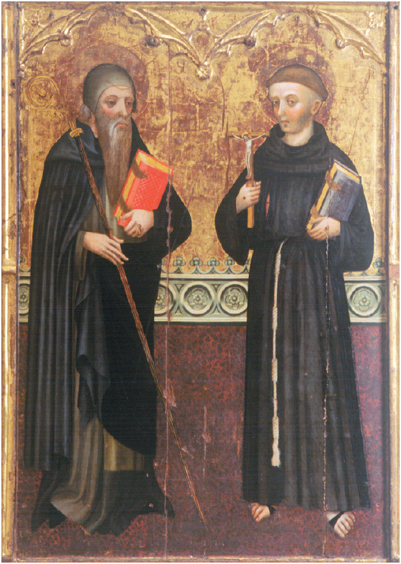 Compartiment central d’un retaule dedicat a sant Antoni Abat i sant Francesc potser procedent de l’església del convent del Carme de Lleida. El seu estil coincideix amb el del retaule de Sant Gabriel de la catedral de Barcelona.