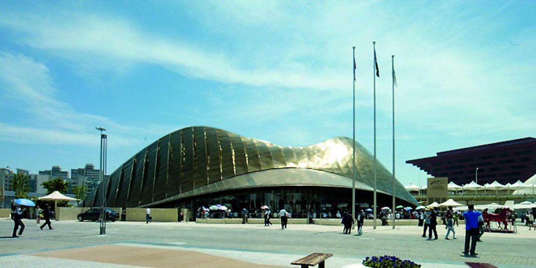 Les gegantines dunes d’acer de Foster per al pavelló dels Emirats Àrabs brillaven amb el sol i creaven unes tonalitats daurades