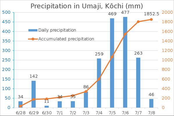 Al llarg del 2018 també es van produir aiguats i inundacions arreu del món. Al Japó, durant el mes de juliol, a Umaji, es van acumular 1.850 mm de pluja en 10 dies, dels quals 1.000 mm van caure en només 4 dies (Figura 3). Aquests aiguats van provocar una riuada amb 225 víctimes mortals.