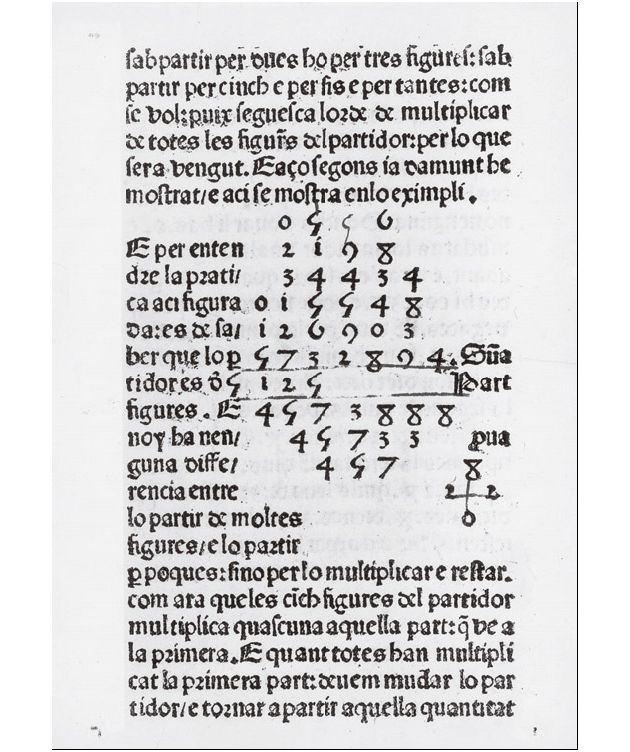 Pàgina de la Summa de l’art d’aritmètica, de F. Santcliment, impresa a Barcelona el 1482, en què ja és utilitzada la numeració aràbiga i es fa propaganda de la seva funcionalitat.