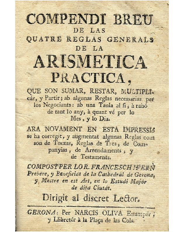 Portada del Compendi breu de las quatre reglas generals de la Arismetica Practica…, de F. Ifern, que fou editat a mitjan s. XVIII. Encara avui “les quatre regles” indiquen l’aritmètica bàsica.