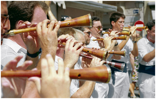 El so de la gralla ha estat present des d’antic en cercaviles, balls o castells. A la fotografia, els grallers de Sitges tocant per la festa major de la vila.
